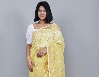 An age-old Indian work of decorating plain muslin with extra cotton weft to create a dense pattern on the transparent fabric. Jamdani is a time-consuming and labor-intensive form of weaving due to the richness of its motifs, which are created directly on the loom using the discontinuous weft technique.