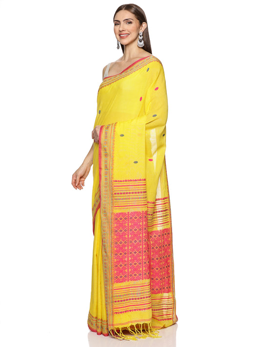 Yellow Pink Handwoven Kadi Cotton Saree