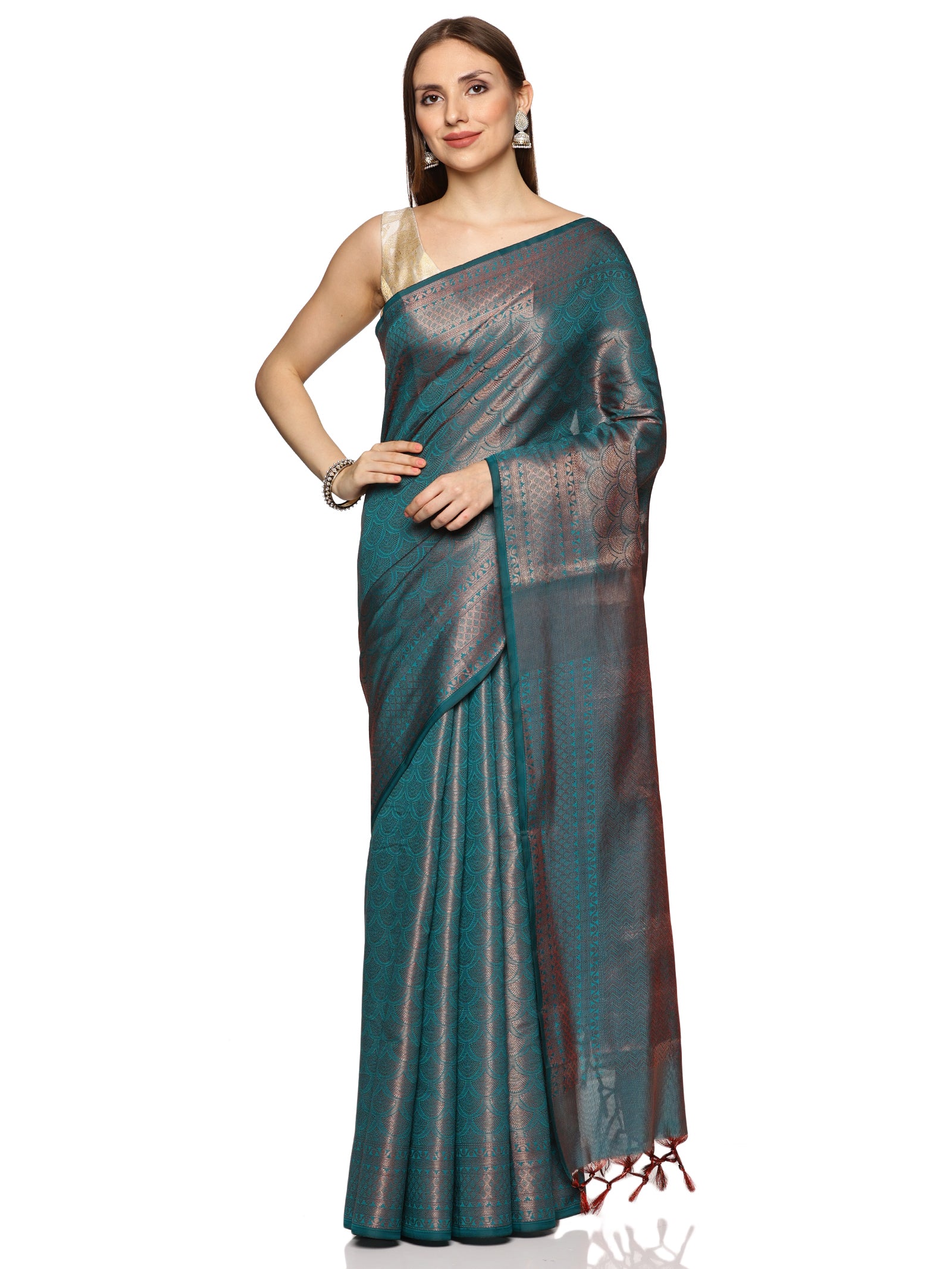 • Net Qty: 1 • Material: Pure Silk Cotton Banarasi Saree • Colour: Bi - Colour : Blue - Green & Copper • Craftsmanship: Hand-Printed • Dimension / Size / Saree length: 6.5 meters • Running Blouse Piece Included: Yes (90 cms) with border to go with • Handcrafted in: Bhagalpur • Occasion: Perfect for cultural events, festive celebrations, and formal gatherings • Texture: Rich, slightly coarse, and naturally lustrous • Design: Unique motifs and intricate patterns, reflecting timeless traditions • Man Hours Spent: 96 hrs • Wash & Care / Maintenance - Dry clean only. Do not tumble dry. Do not dry in direct sunlight. Store in cool & dry place wrapped in muslin fabric. • Free shipping within India. Shipping out of India is as per weight calculation at checkout. • Dispatch Timeline: Dispatched in maximum of 2 business days. • Country of Origin: India • Return Policy: This item is eligible for replacement, within 7 days of delivery, only in an unlikely event of damaged, defective or different item delivered to you.