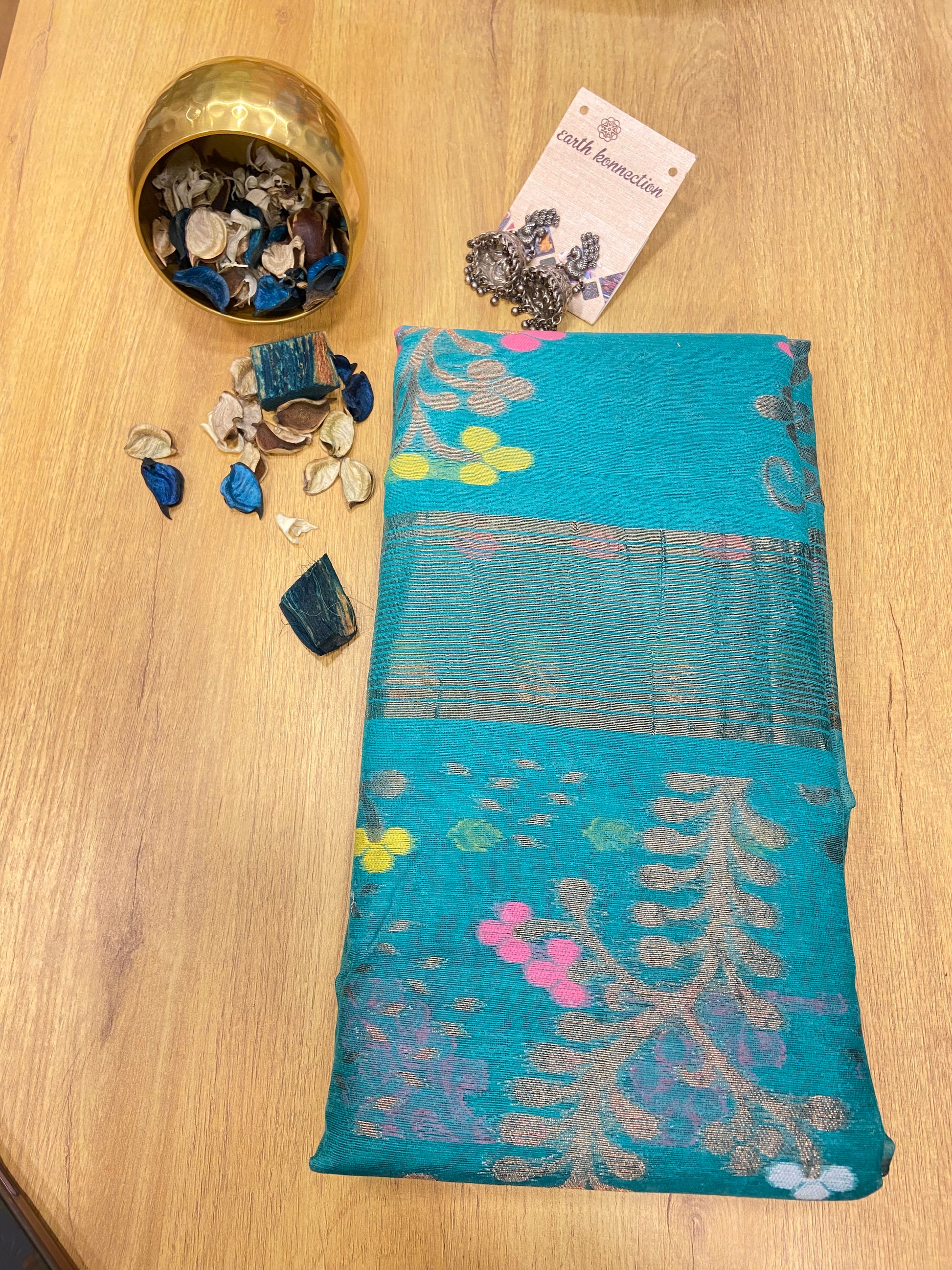 Bengali sarees are a beautiful representation of Bengal's reach cultural heritage and artistic traditions. Jamdani is touted as the most advance hand weaving technique in the world, in this saree has rama green with zari and multi flowers full body.