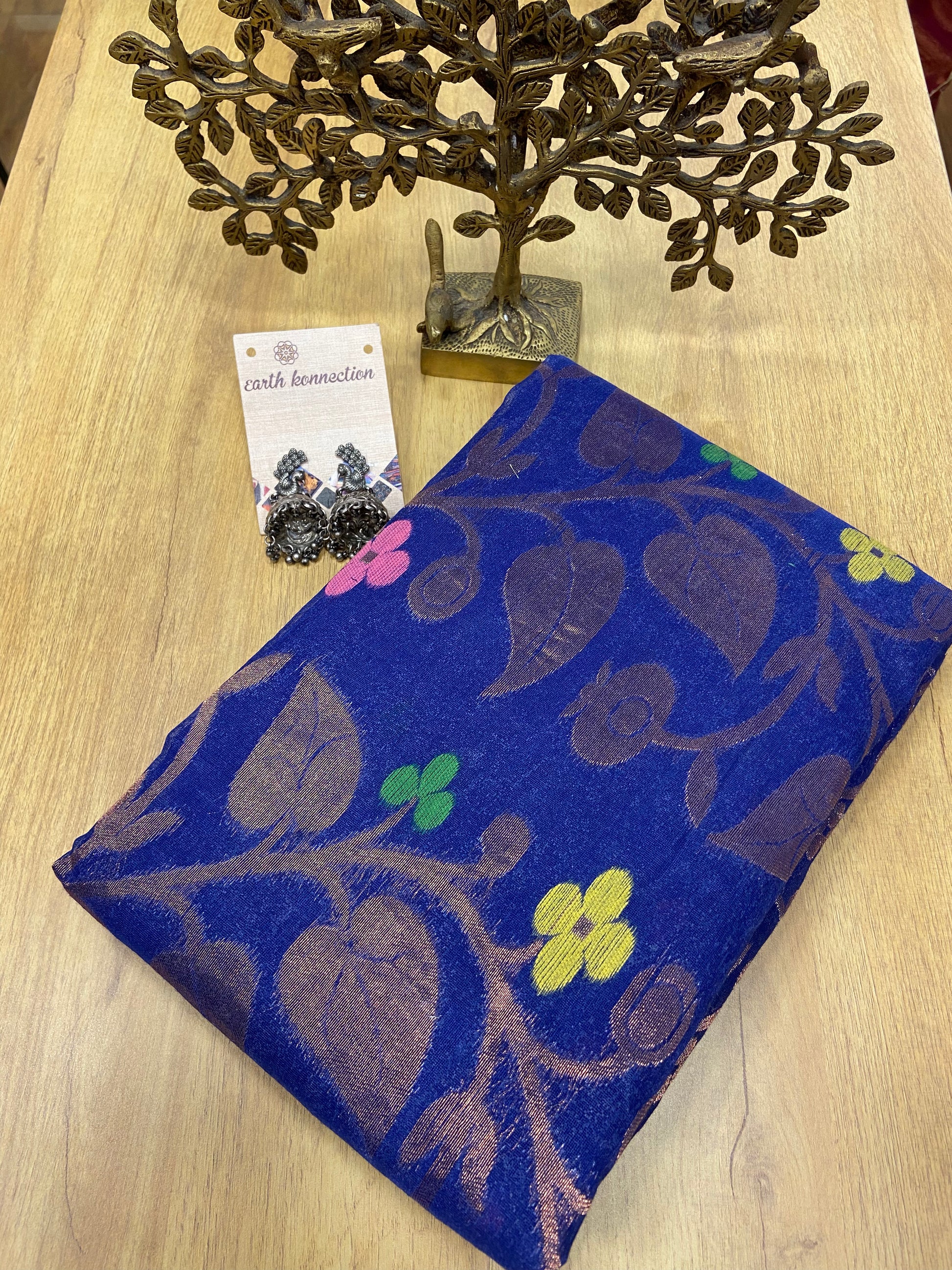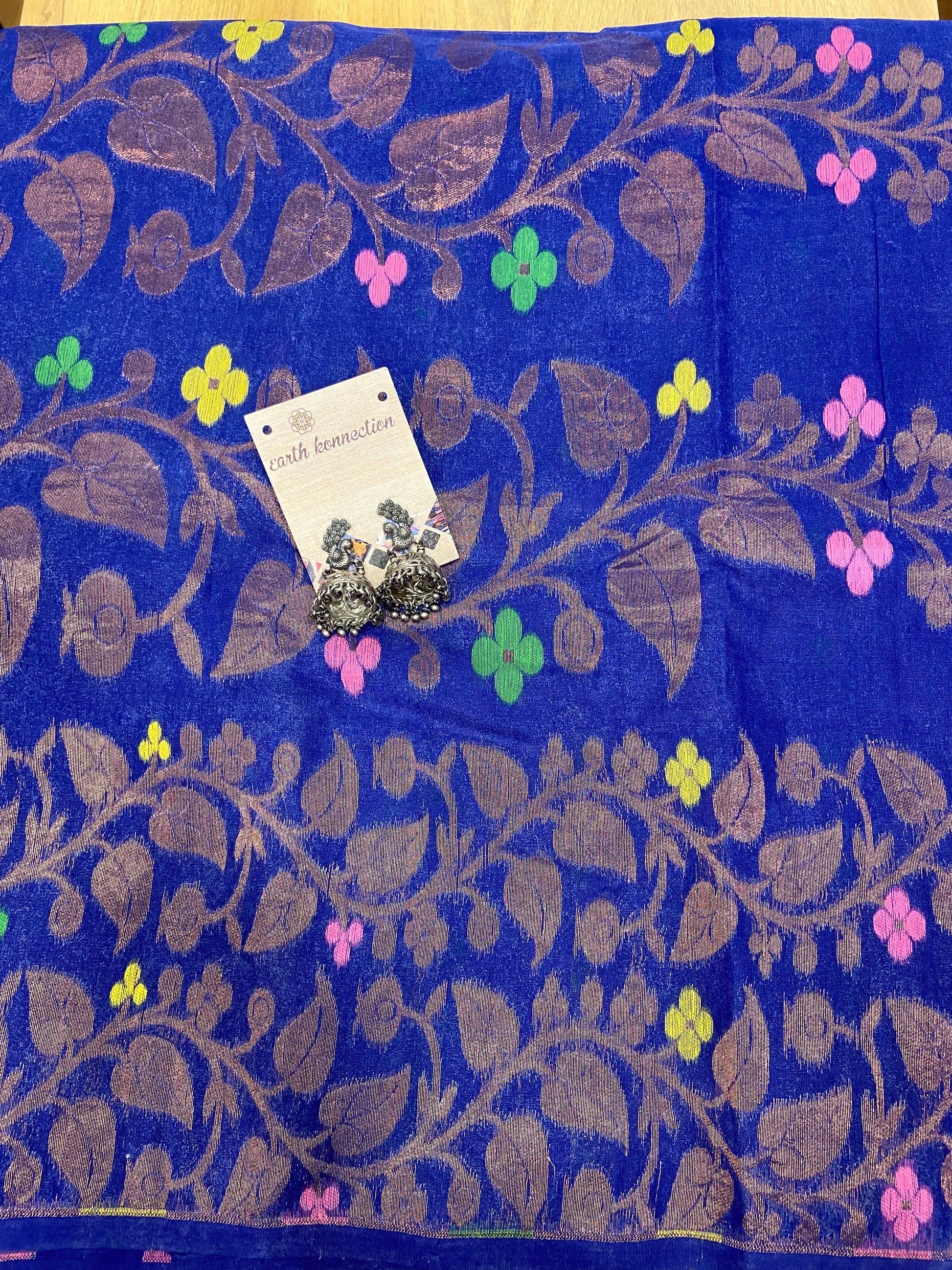 Bengali sarees are a beautiful representation of Bengal's reach cultural heritage and artistic traditions. Jamdani is touted as the most advance hand weaving technique in the world, in this saree has blue with multi colour flower with copper zari full body.