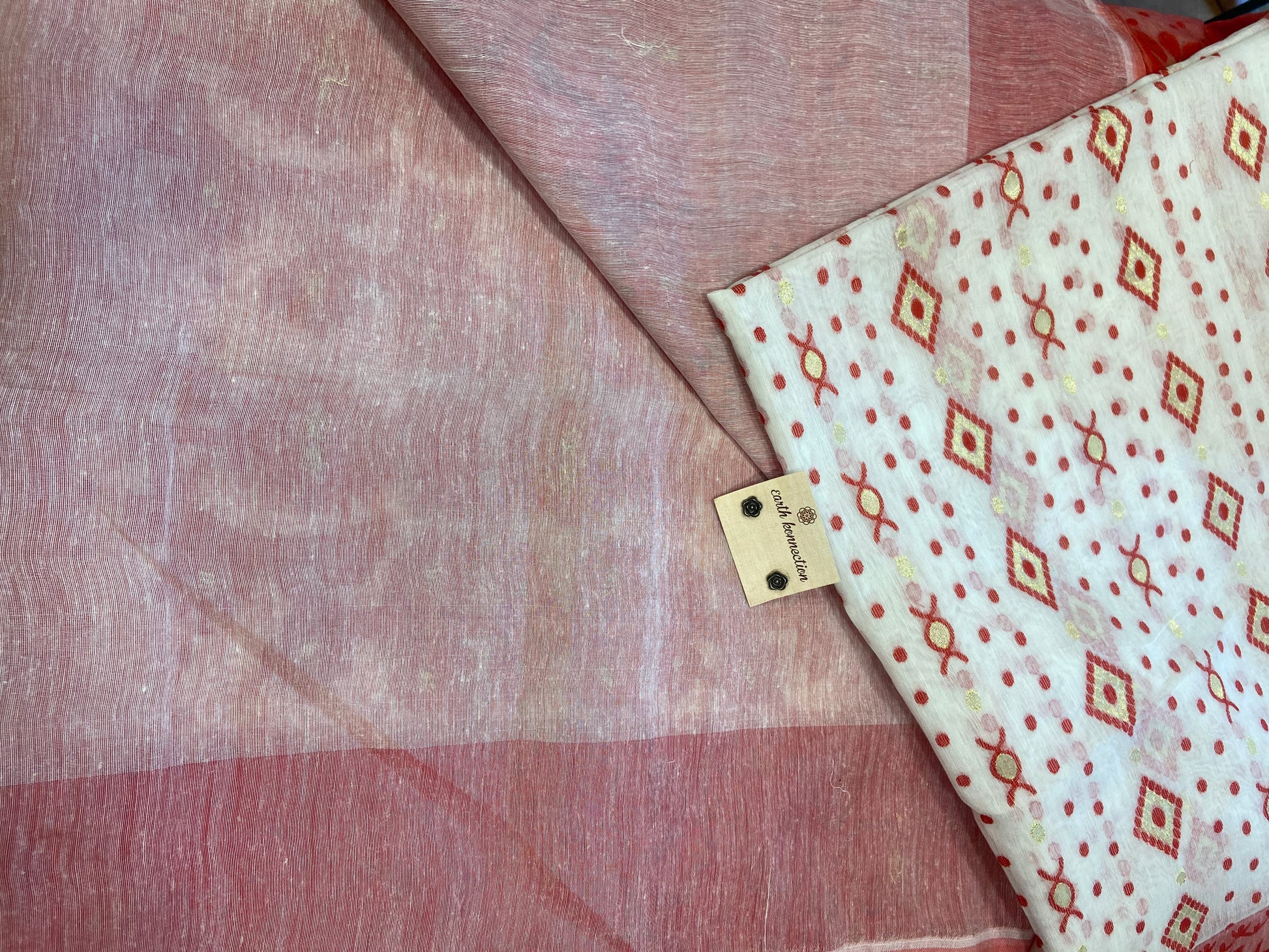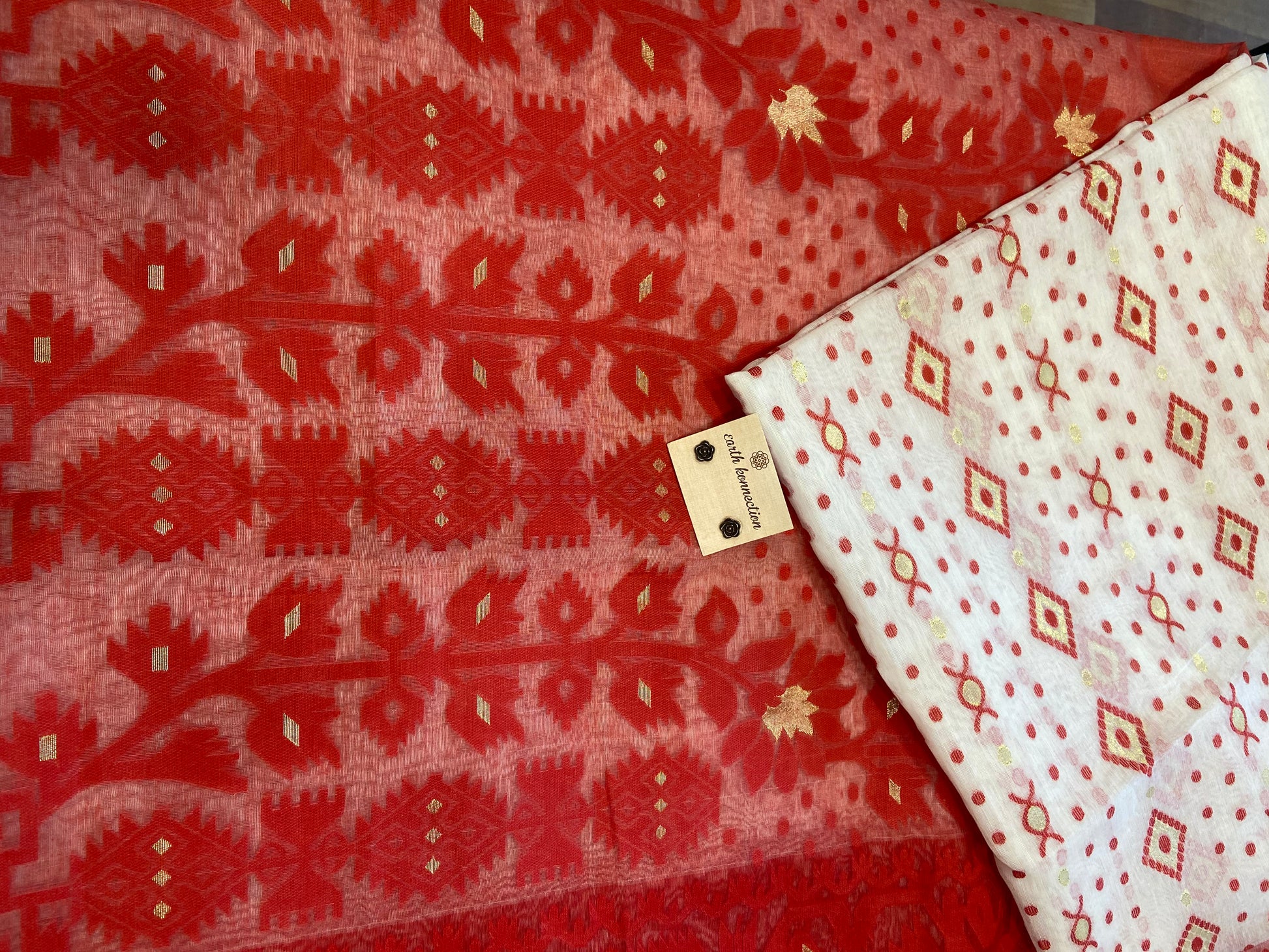 Bengali sarees are a beautiful representation of Bengal's reach cultural heritage and artistic traditions. Jamdani is touted as the most advance hand weaving technique in the world, in this saree has white with red and pink soft, beautiful saree.