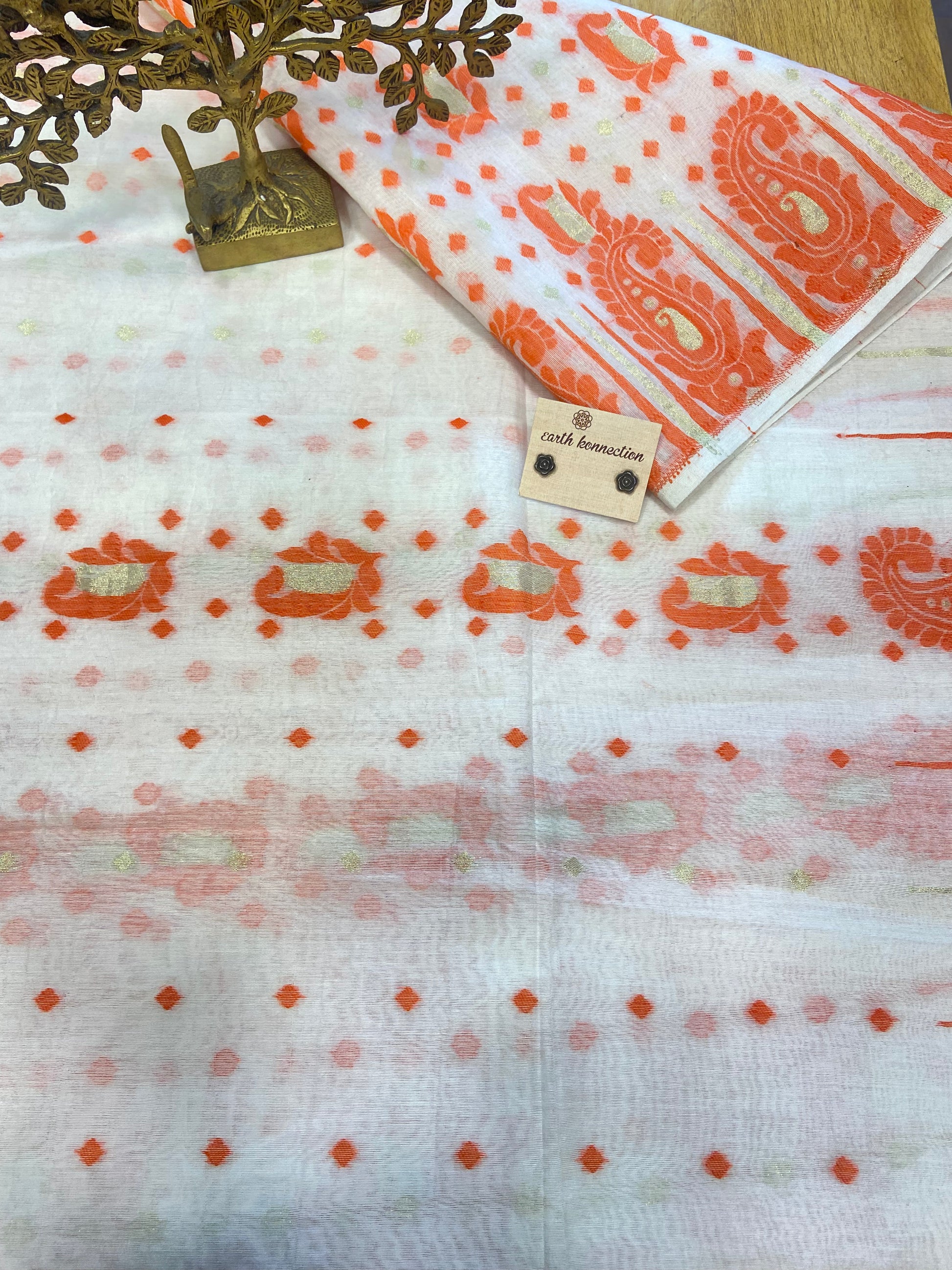 Bengali sarees are a beautiful representation of Bengal's reach cultural heritage and artistic traditions. Jamdani is touted as the most advance hand weaving technique in the world, in this saree has white with orange and pink soft, beautiful saree.