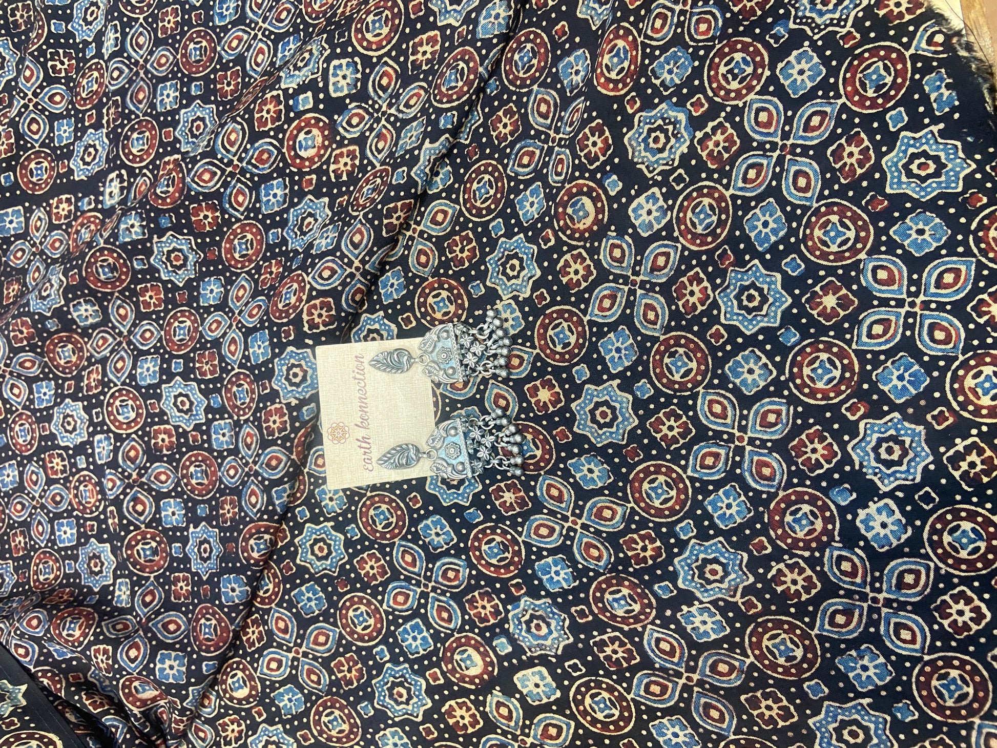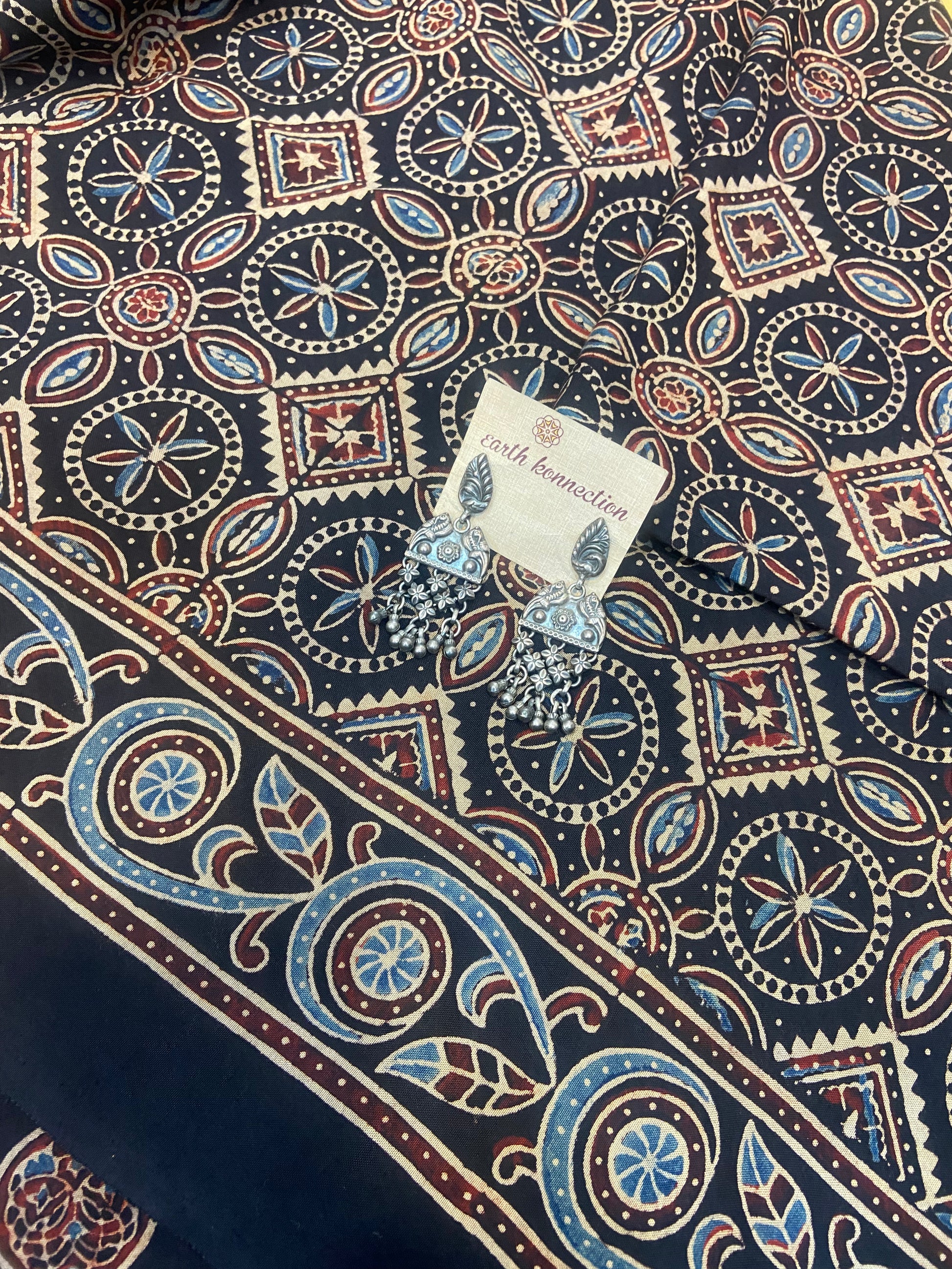 Modal silk sarees are a blend of modal, a semi-synthetic fiber made from beechwood pulp, and silk, which results in a soft, lightweight, and lustrous fabric. This combination creates a material that is more durable and easier to care for than pure silk, Ajrakh sarees, with roots tracing back to the Indus Valley civilization, represent the zenith of traditional block printing. Celebrated for their intricate geometric and floral patterns in deep, earthy tones like indigo, black, red, and mustard, these sarees embody a meticulous multi-stage dyeing and printing process.