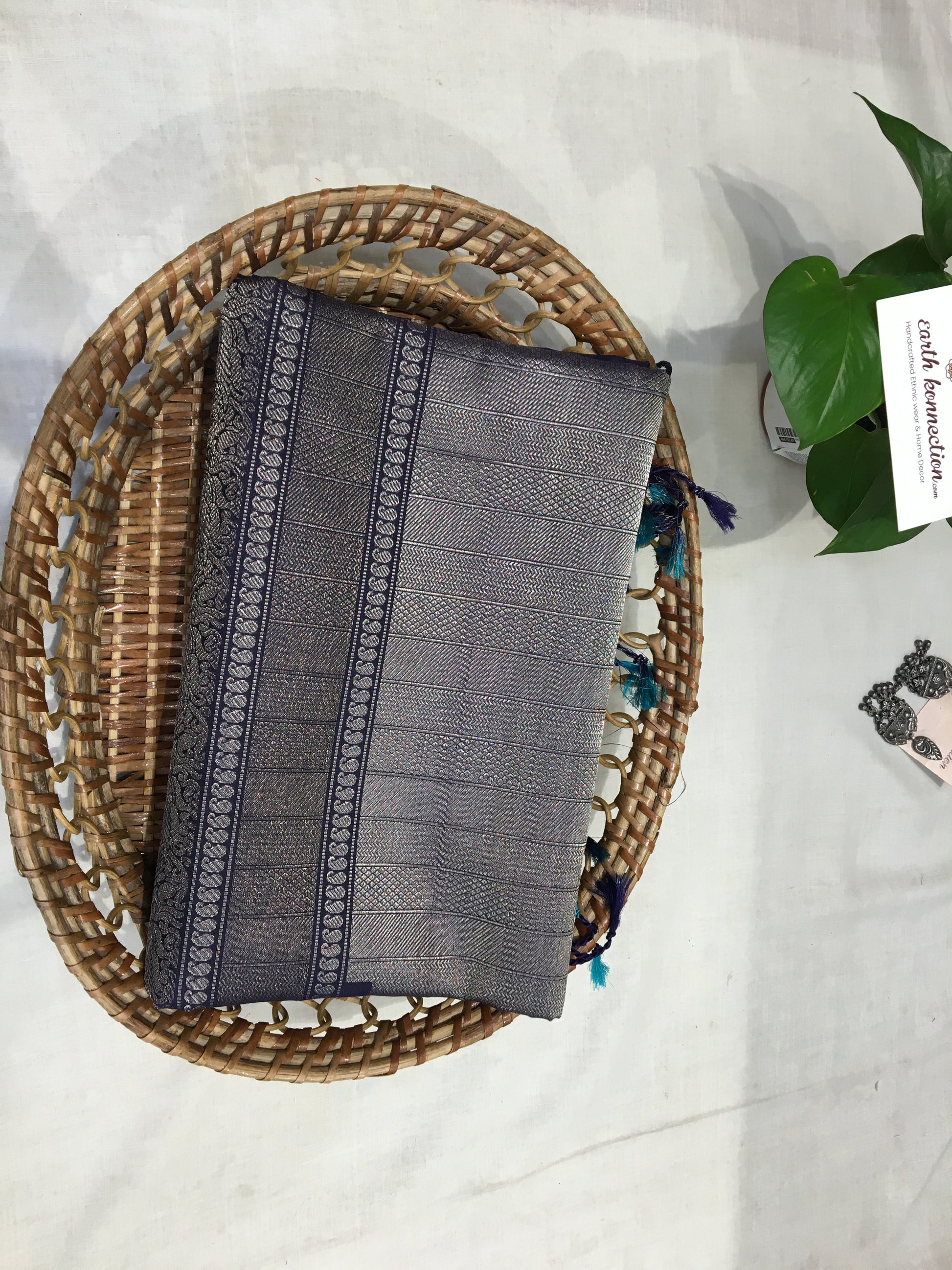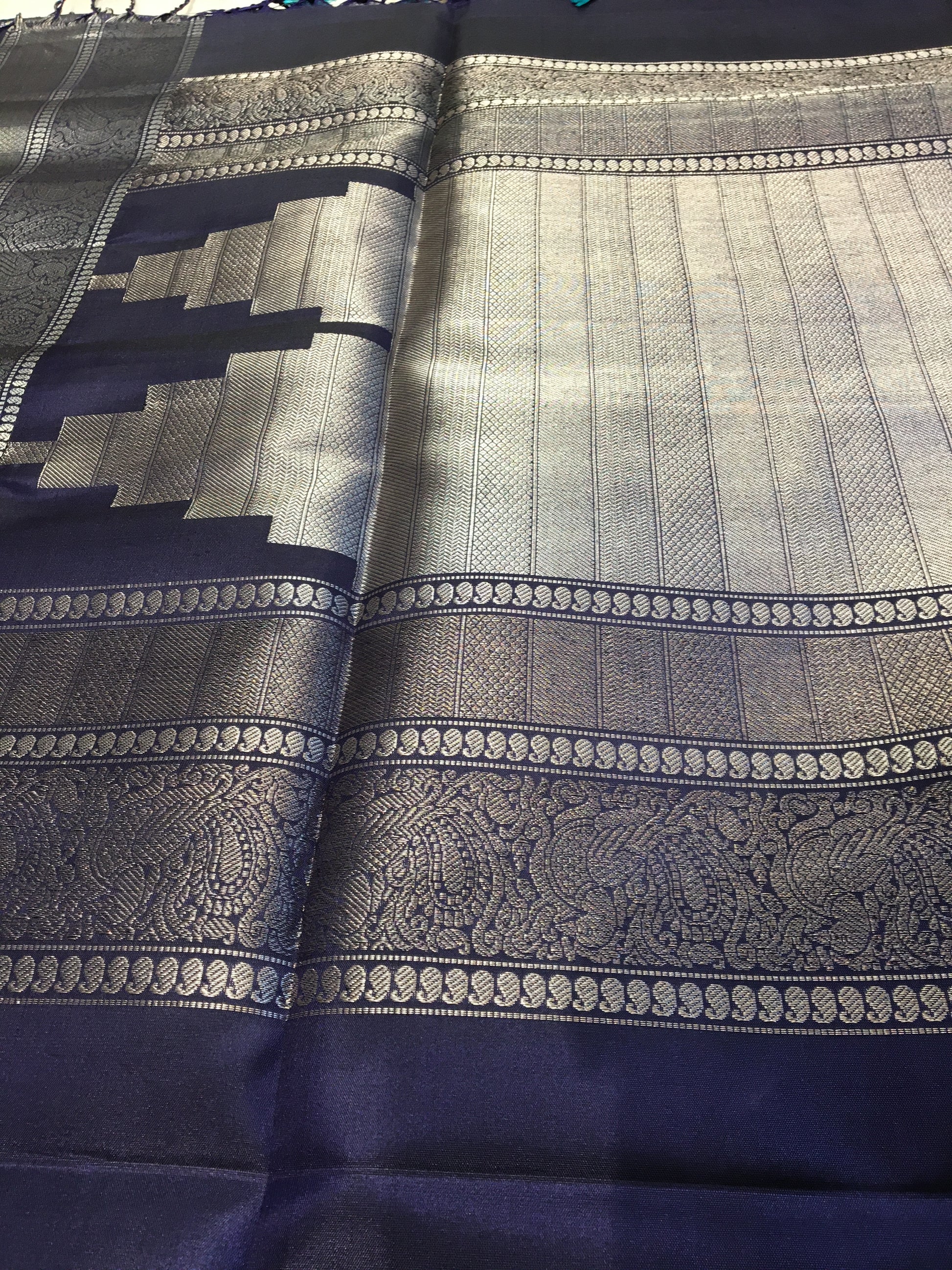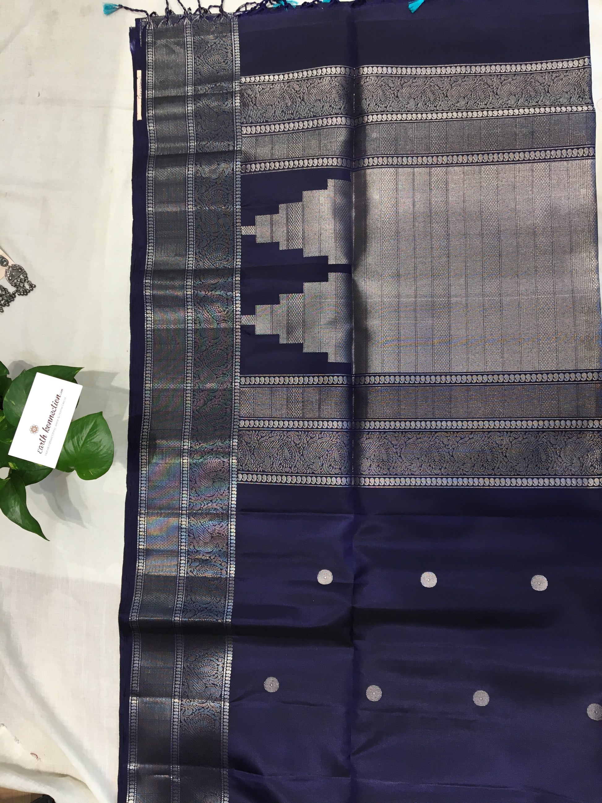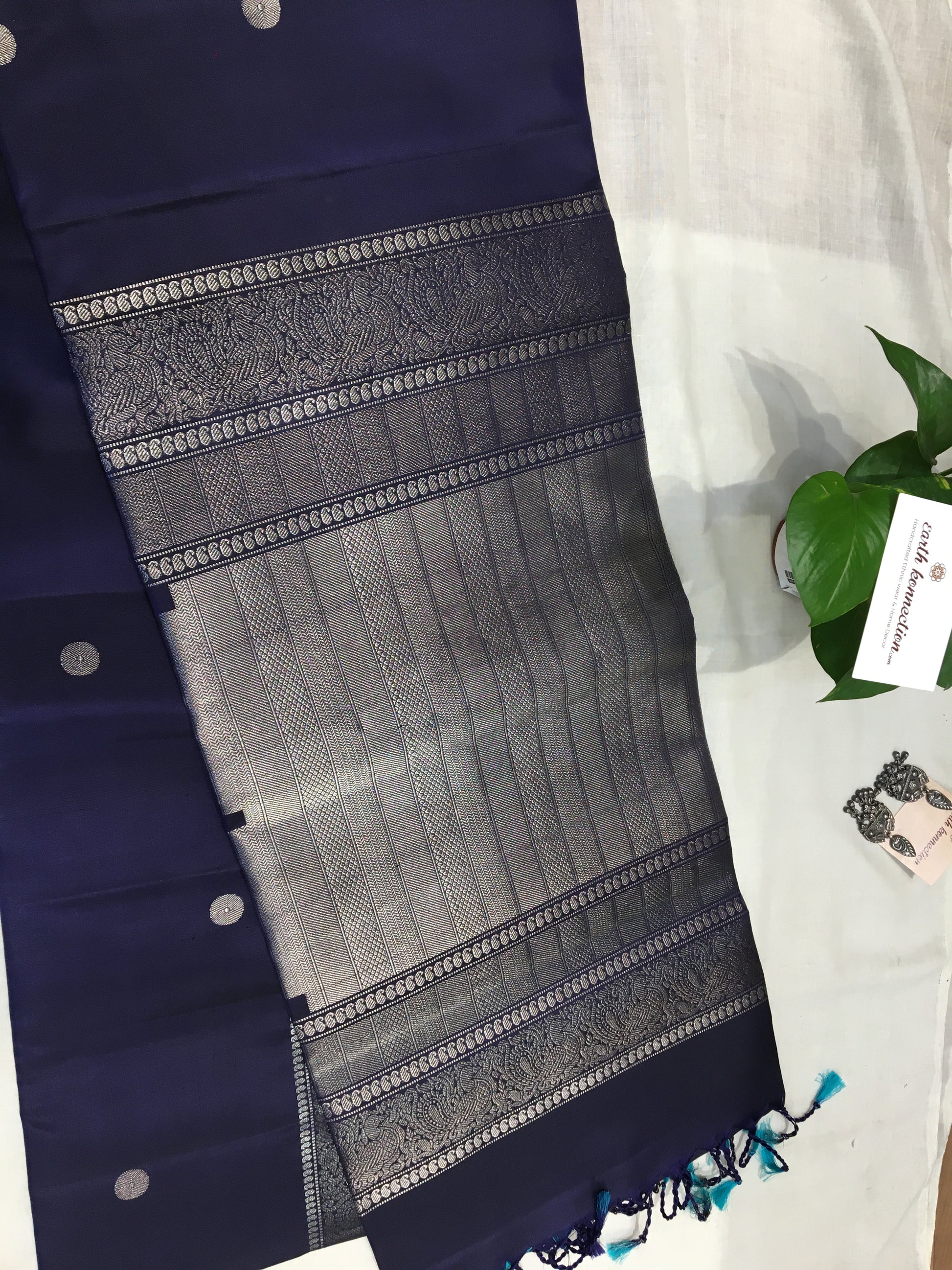 A pure kanjivaram silk saree nevy blue with rich silver pallu, full body has buttas.