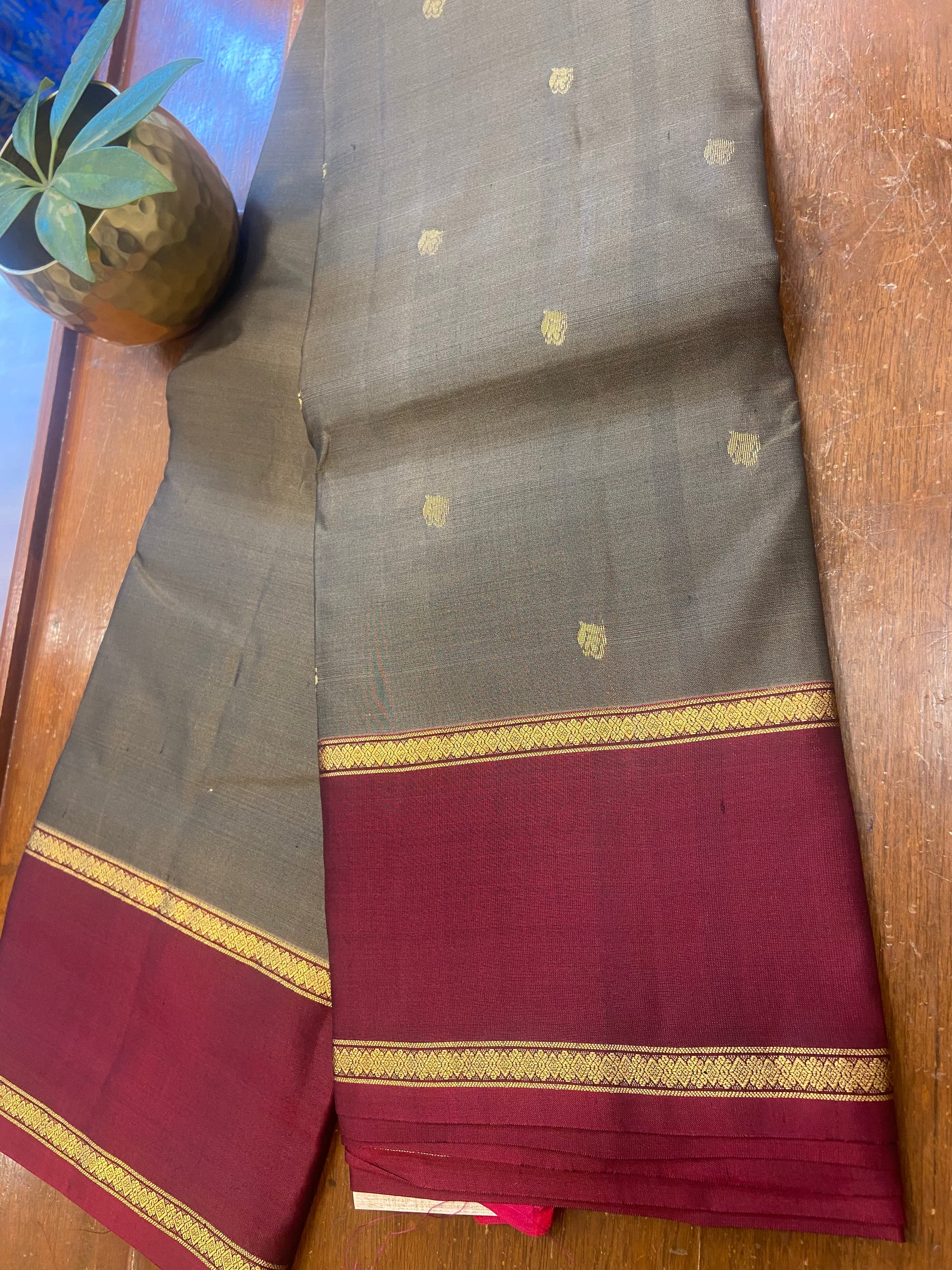 A Pure silk kanjivaram silk saree is luxurious handwoven silk saree. Is is characterized its by rich lustrous silk, intricate desinge and use of zari (gold thread) work. light brown full body with small buttas and rad border beautifull classy saree.