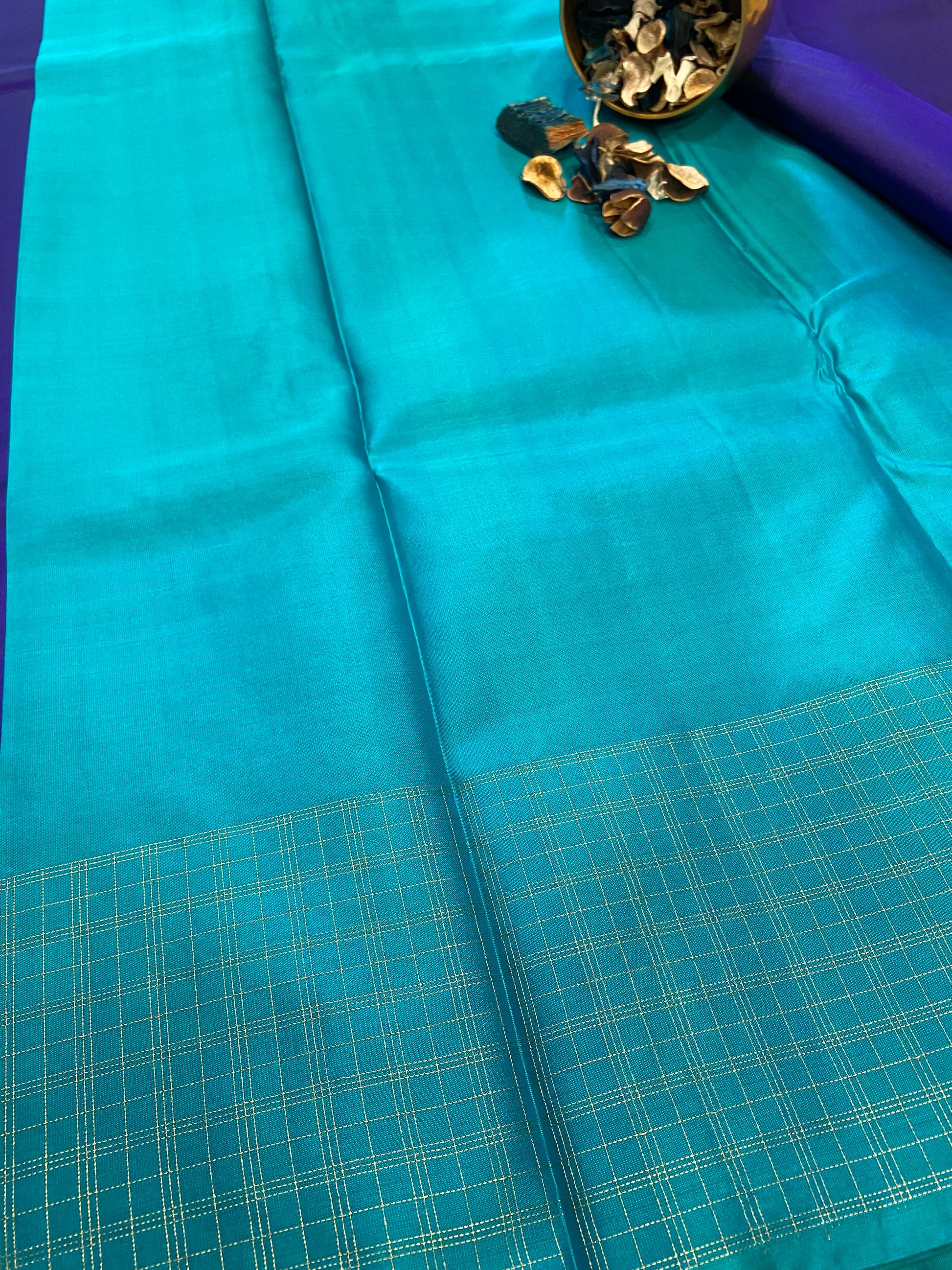 A pure kanjivaram silk saree full body purple with small buttas and border rama green with golden zari beautifull and elegant saree.