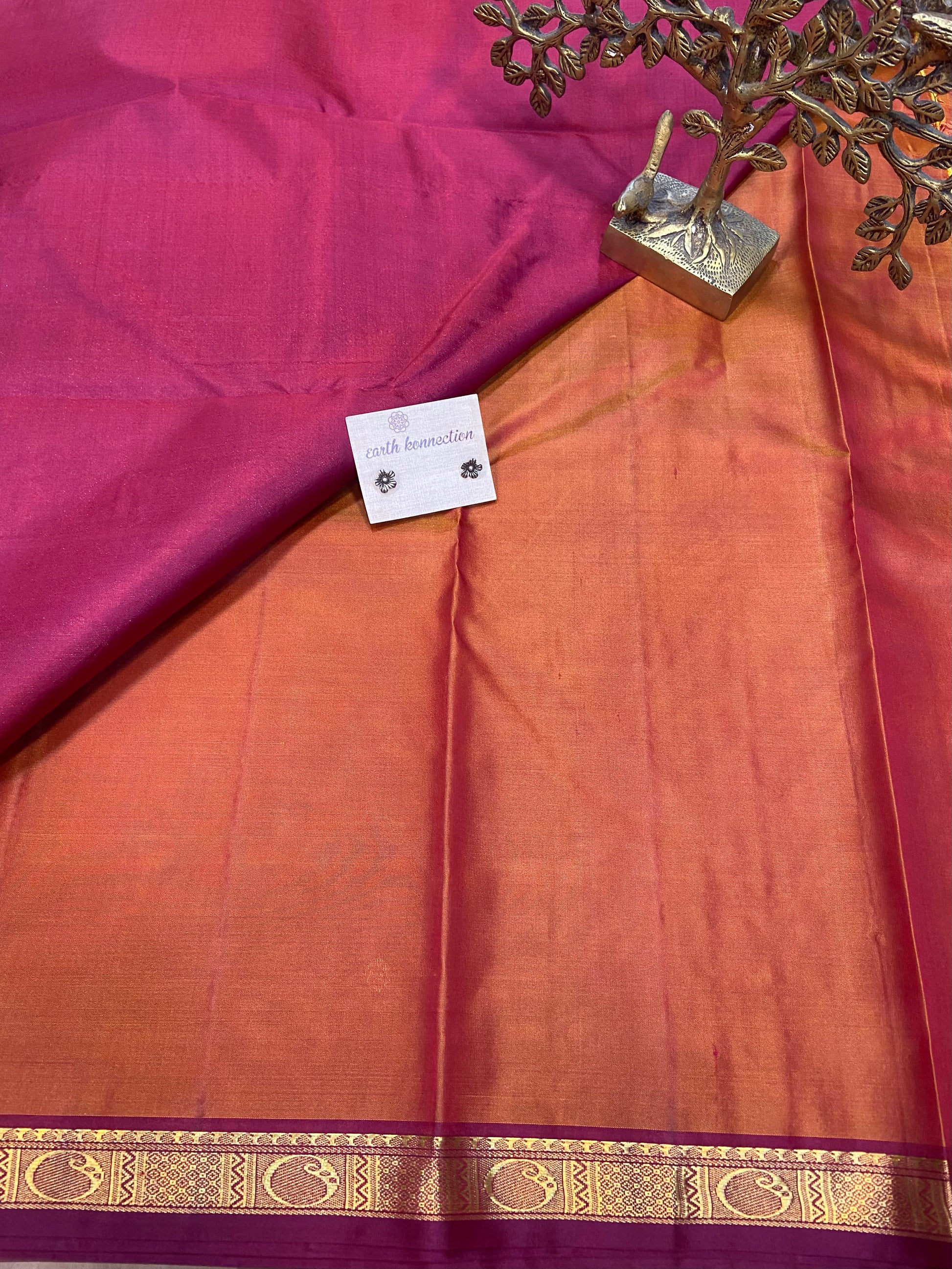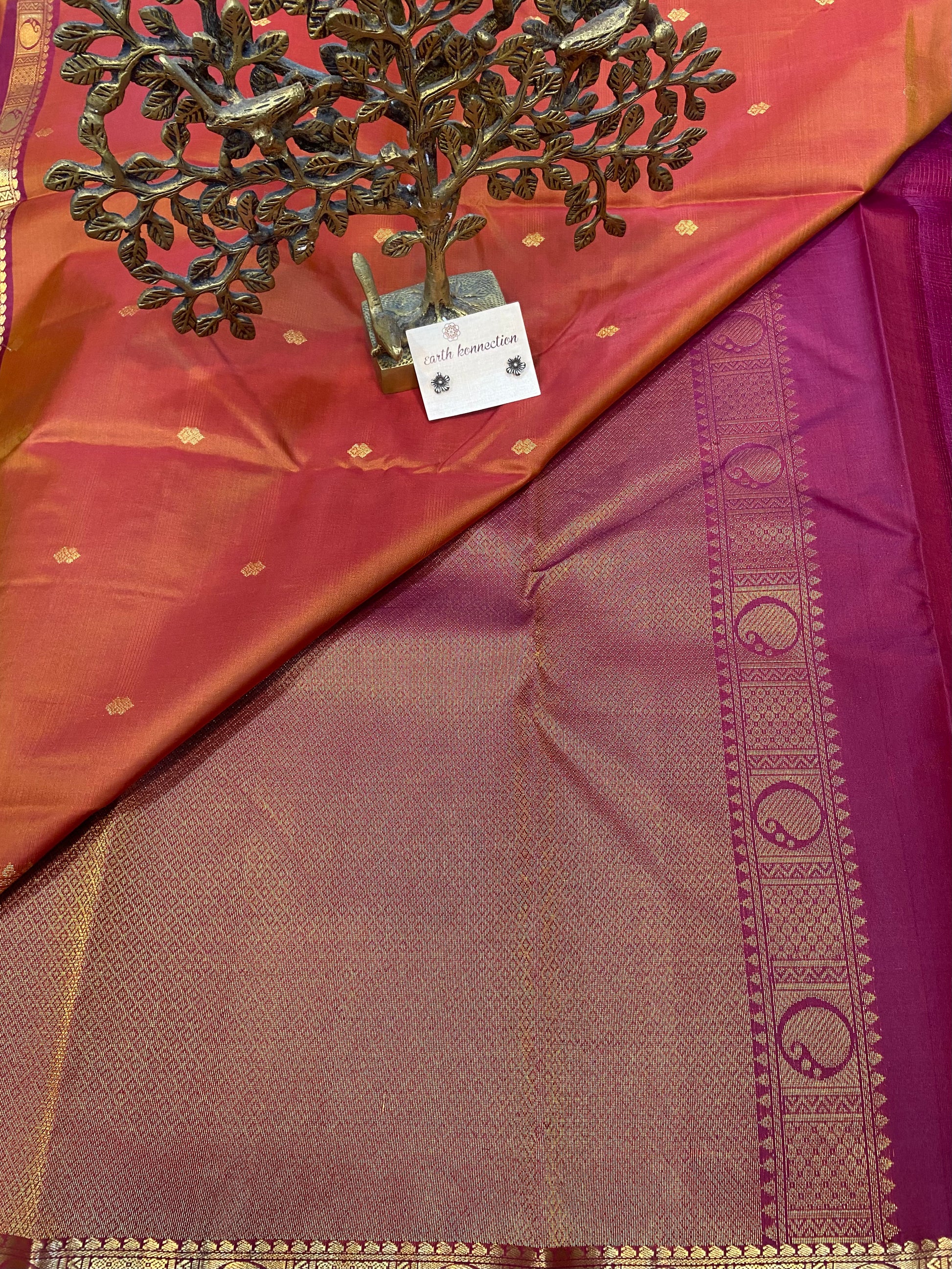 A pure kanjivaram silk saree marron border with rust orange with small buttas full body and border has paissy tradition motif.