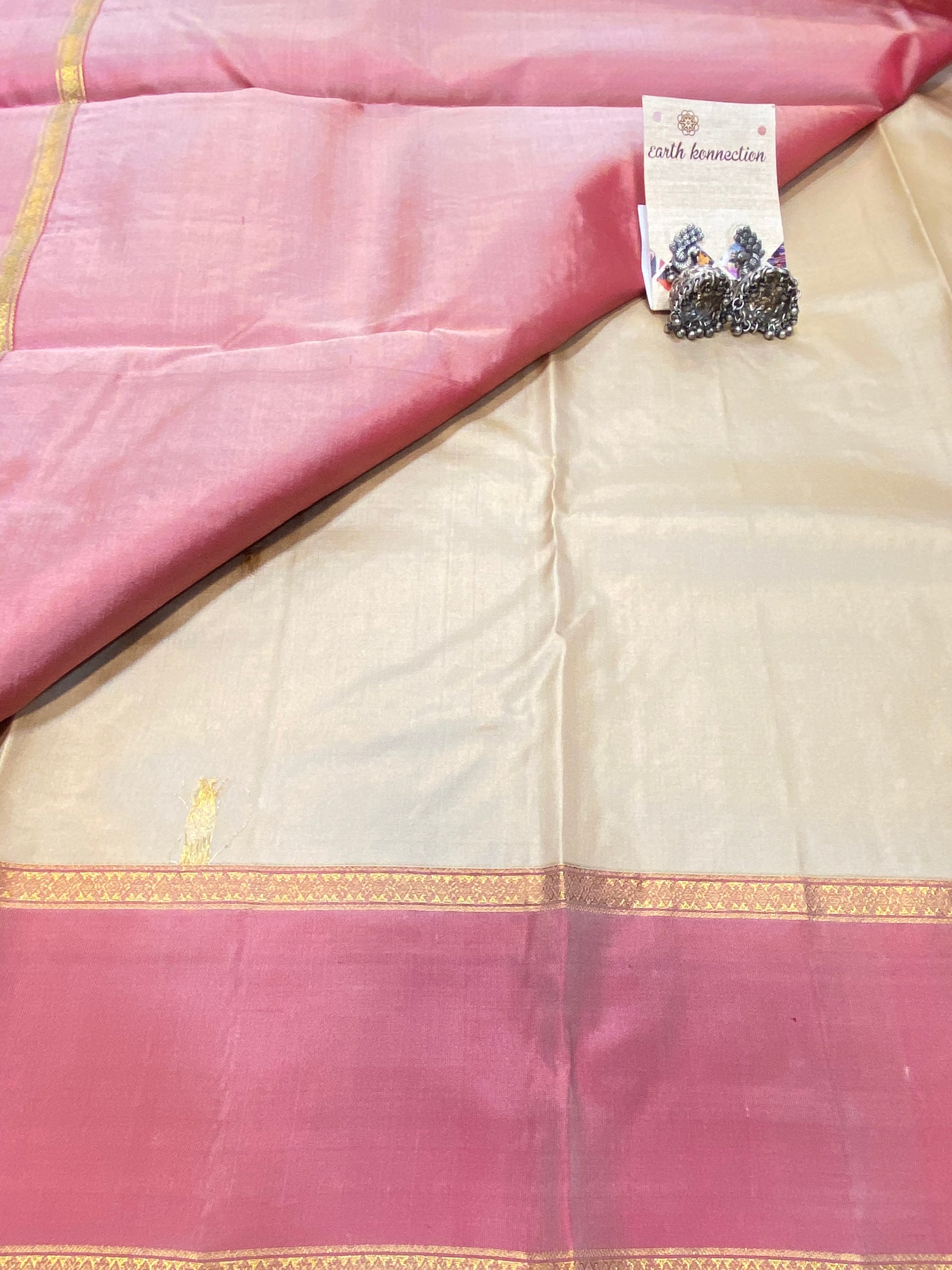 A Pure silk kanjivaram silk saree is luxurious handwoven silk saree. It is characterized its by rich lustrous silk, intricate desinge and use of zari (gold thread) work. Repeating motifs or pattern's woven to the body of the contrasts colours. full body beige with small buttas and red space border with zari beautifull and elegant saree.