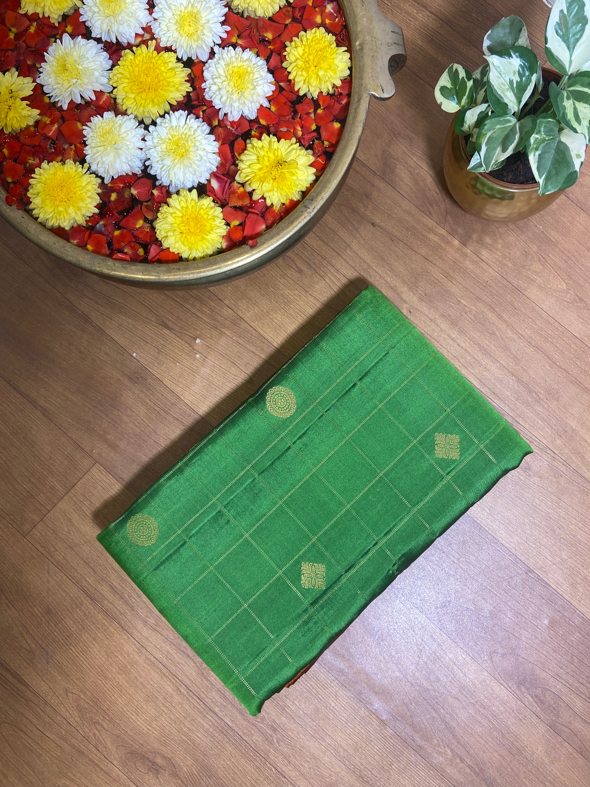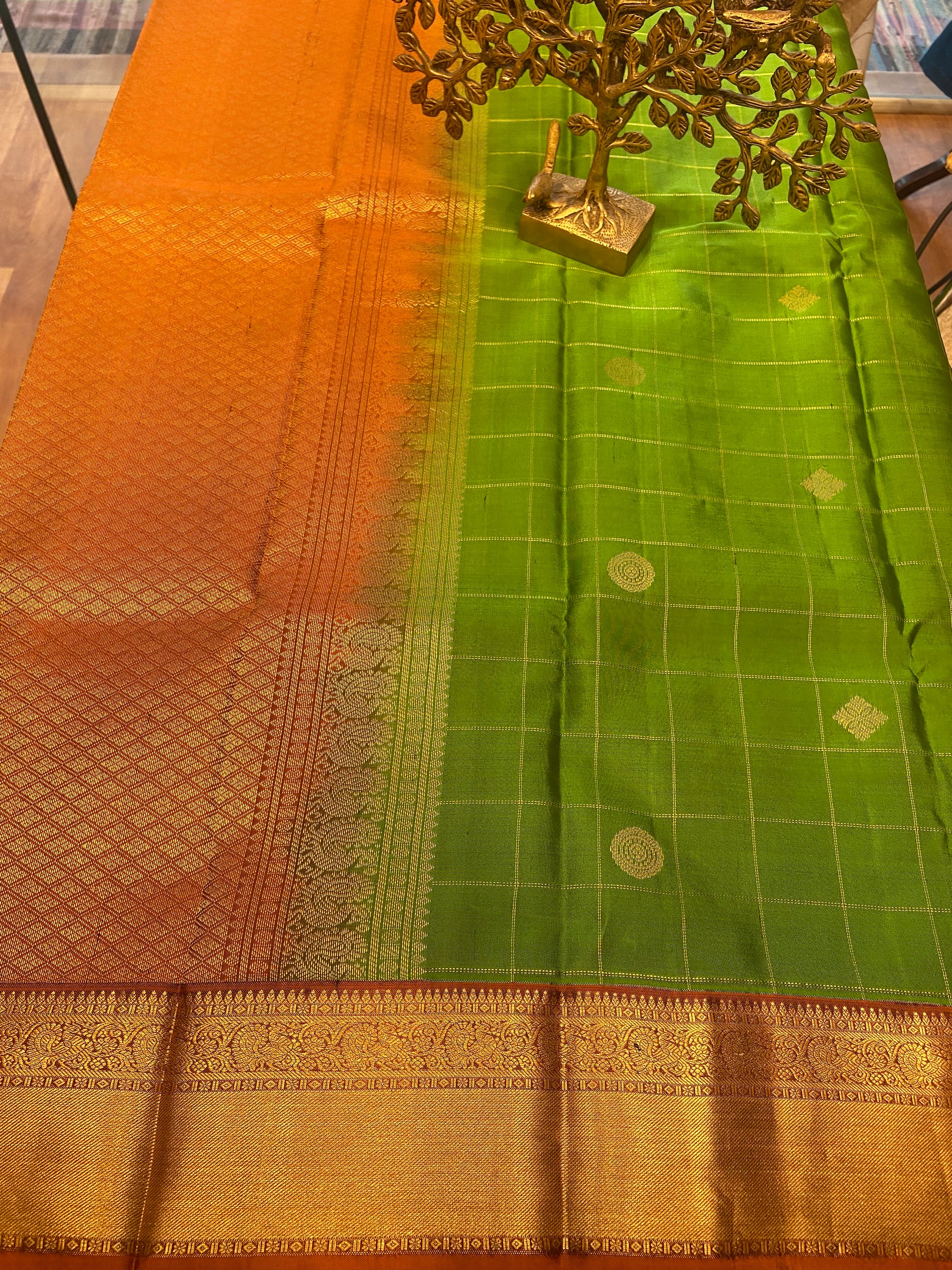 A pure kanjivraram silk saree green with checks and butta and border has orange with peacock motif and rich pallu .