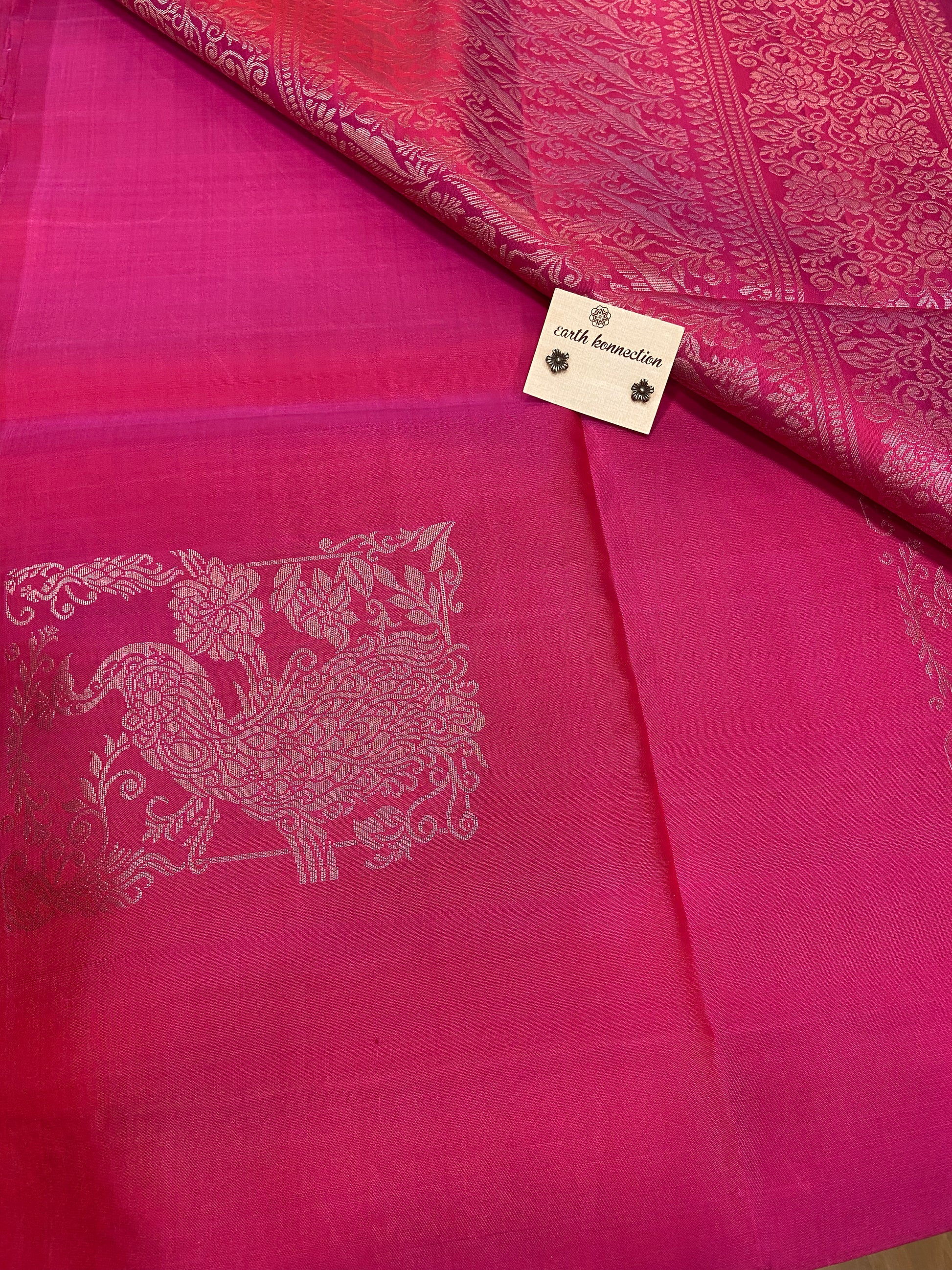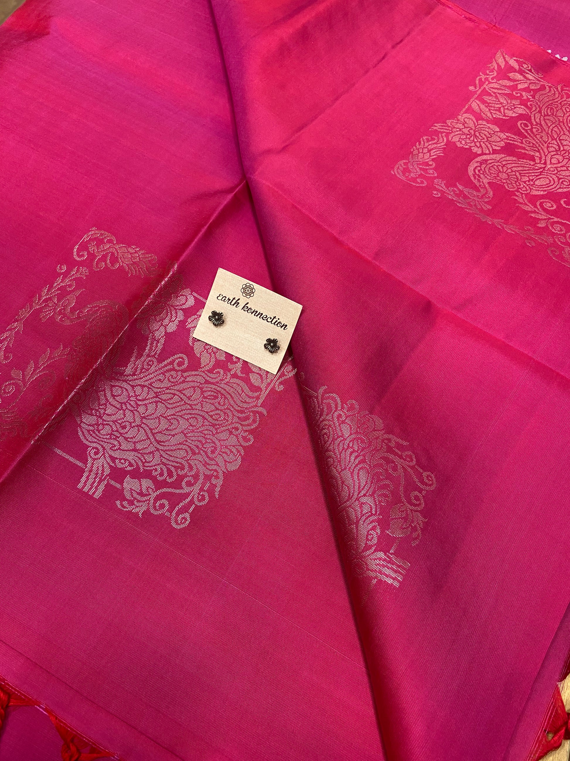 A Pure kanjivaram silk saree is luxurious handwoven silk saree. It is characterized its by rich lustrous silk, intricate desinge and use of zari (gold thread) work. The ''butta refer's to the small , repeating motifs or pattern's woven to the body of the saree, often in zari or contrasts colours.