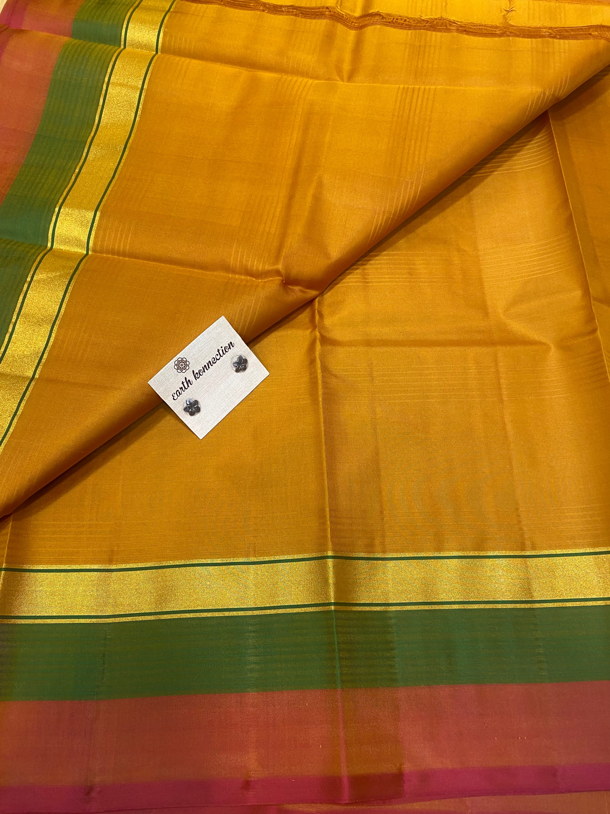 A pure kanjivaram silk saree plain mustered yellow with small gold and green and orange border look classy.