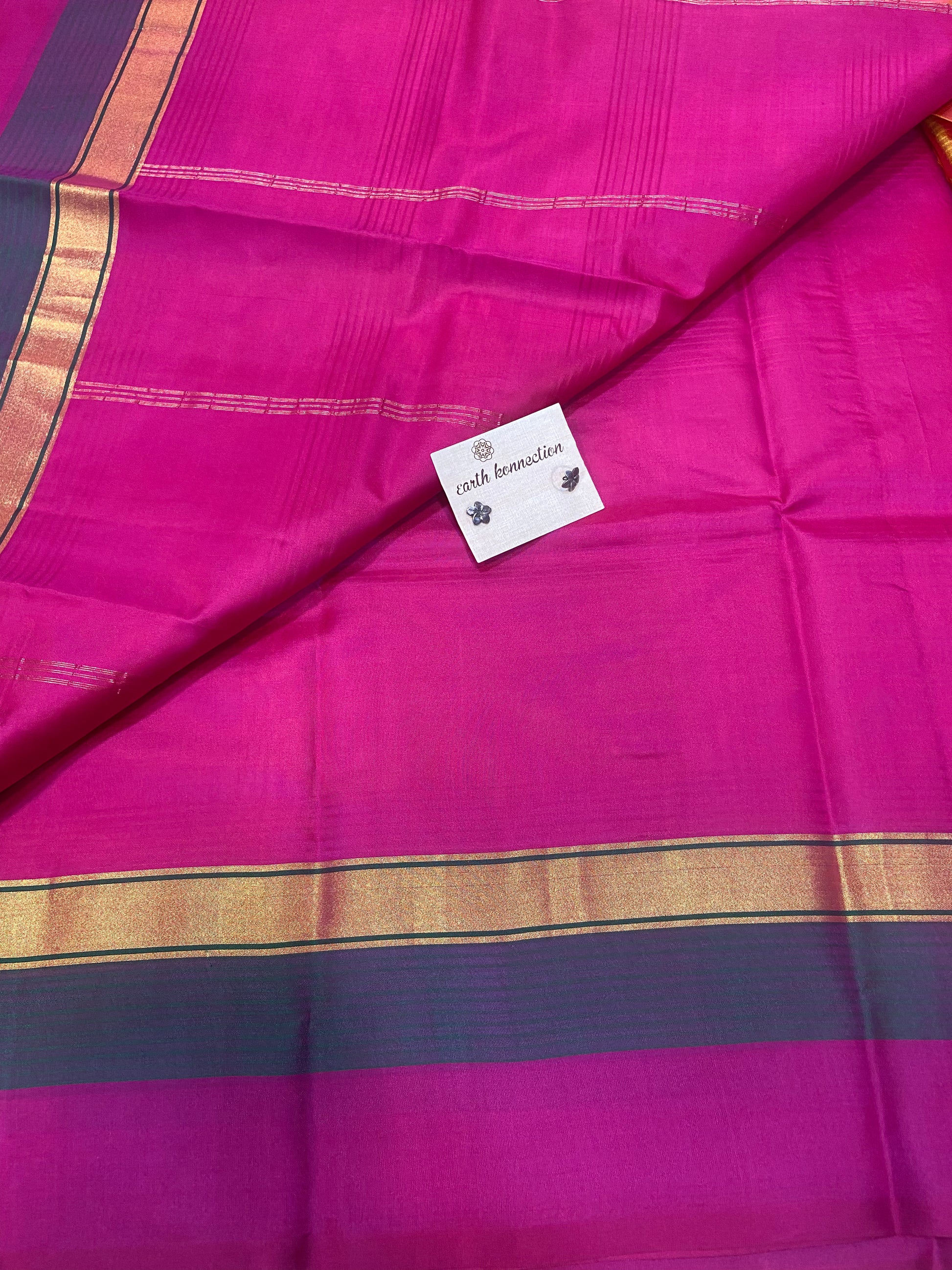 A pure kanjivaram silk saree pain body rust orange with gold, green and pink border.