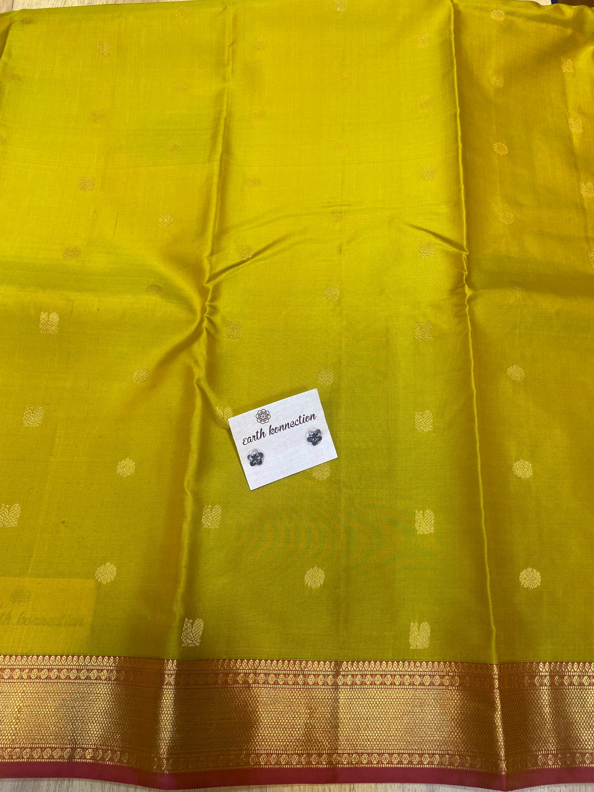 A pure kanjipuram silk saree yellow with small butta full body and red small border with zari.