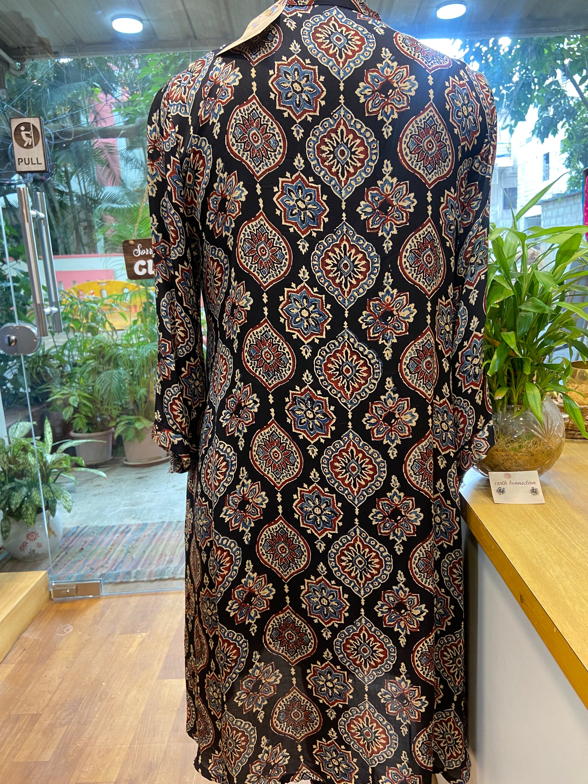 Ajrakh is a traditional block printing technique that originated in the Kutch region of Gujarat, India. The word 'Ajrakh' comes from the Arabic word 'Azrak', which means blue. The fabric is made using natural dyes and traditional block-printing methods, using intricate geometric and floral patterns.