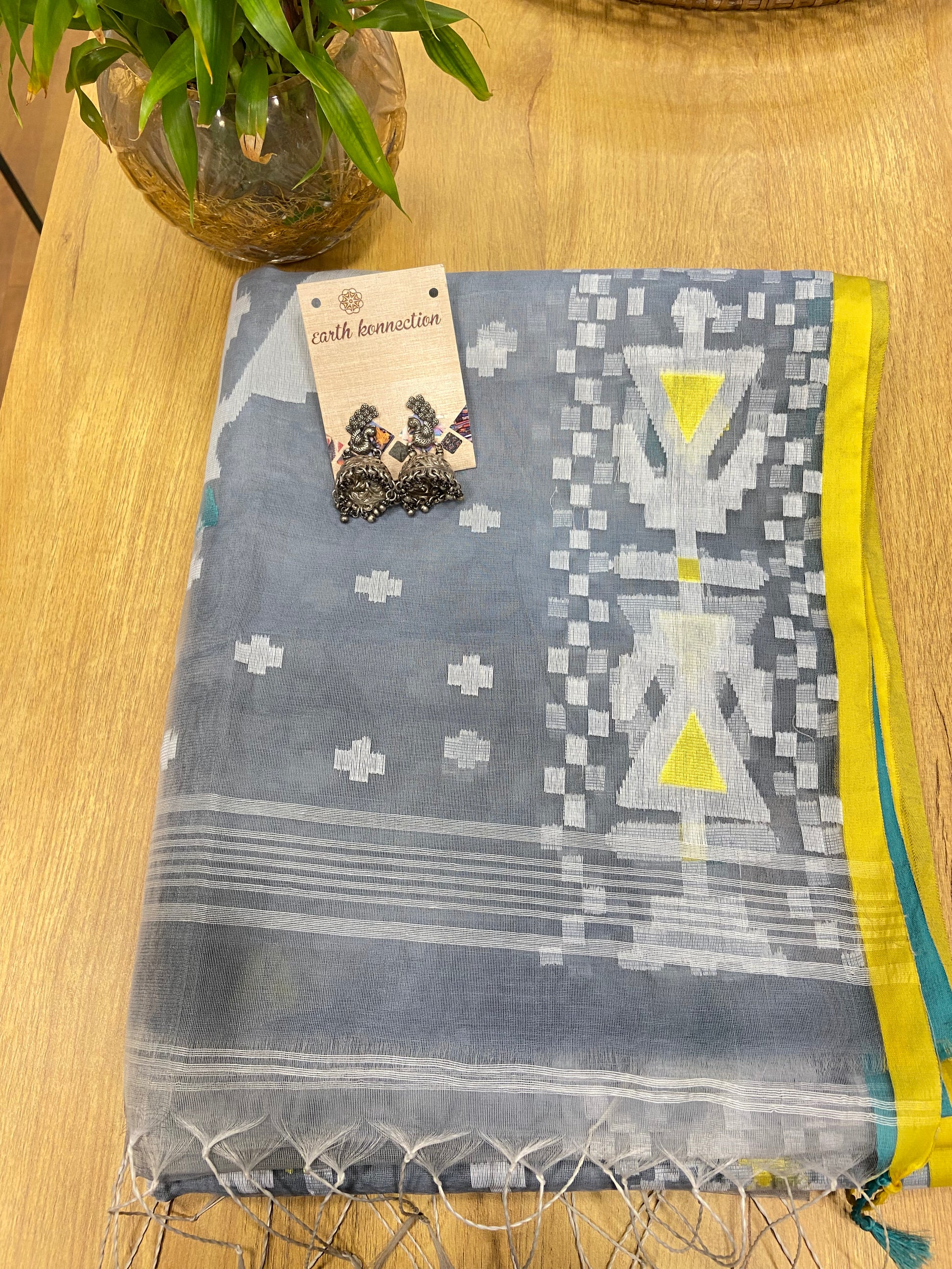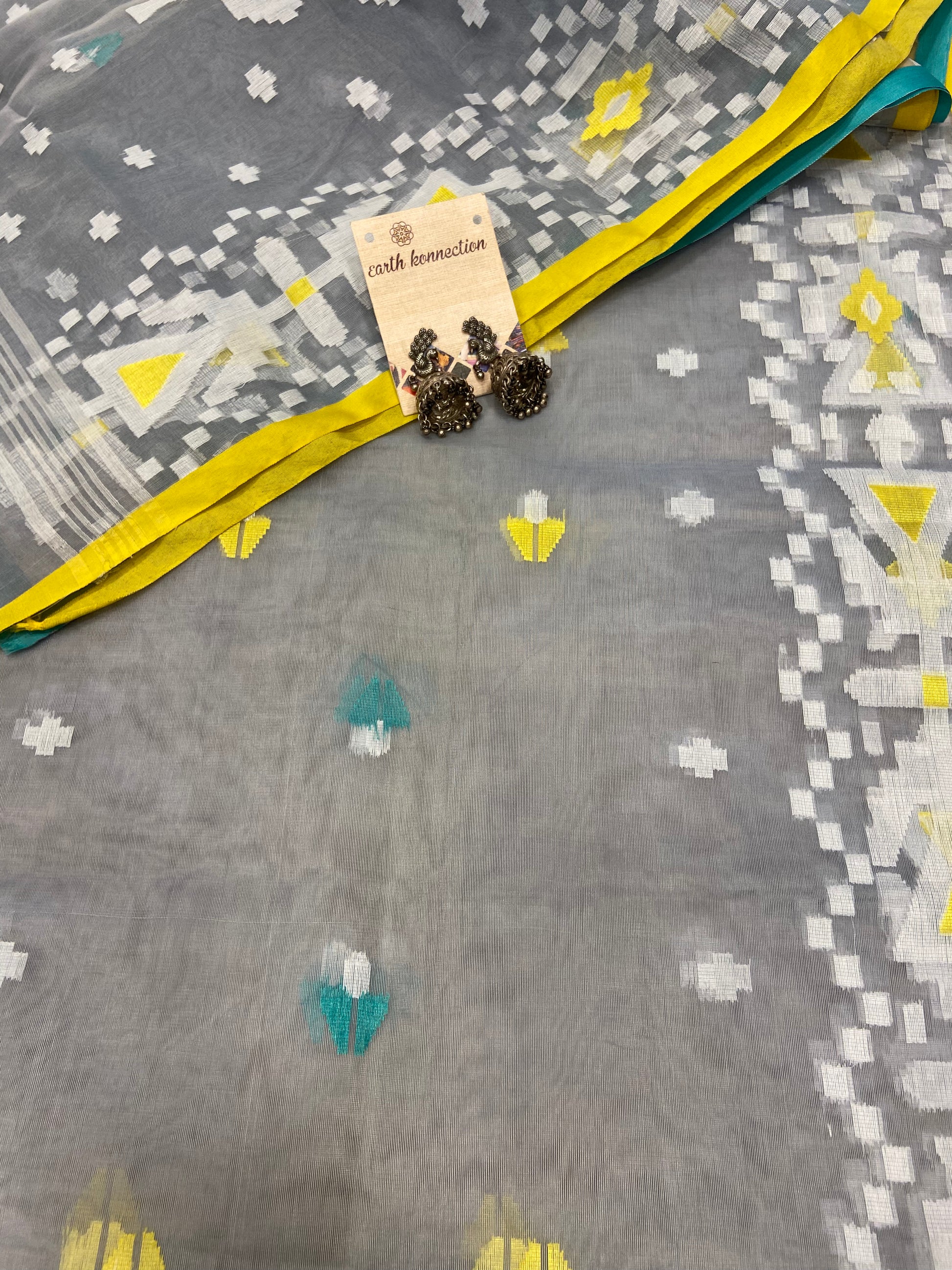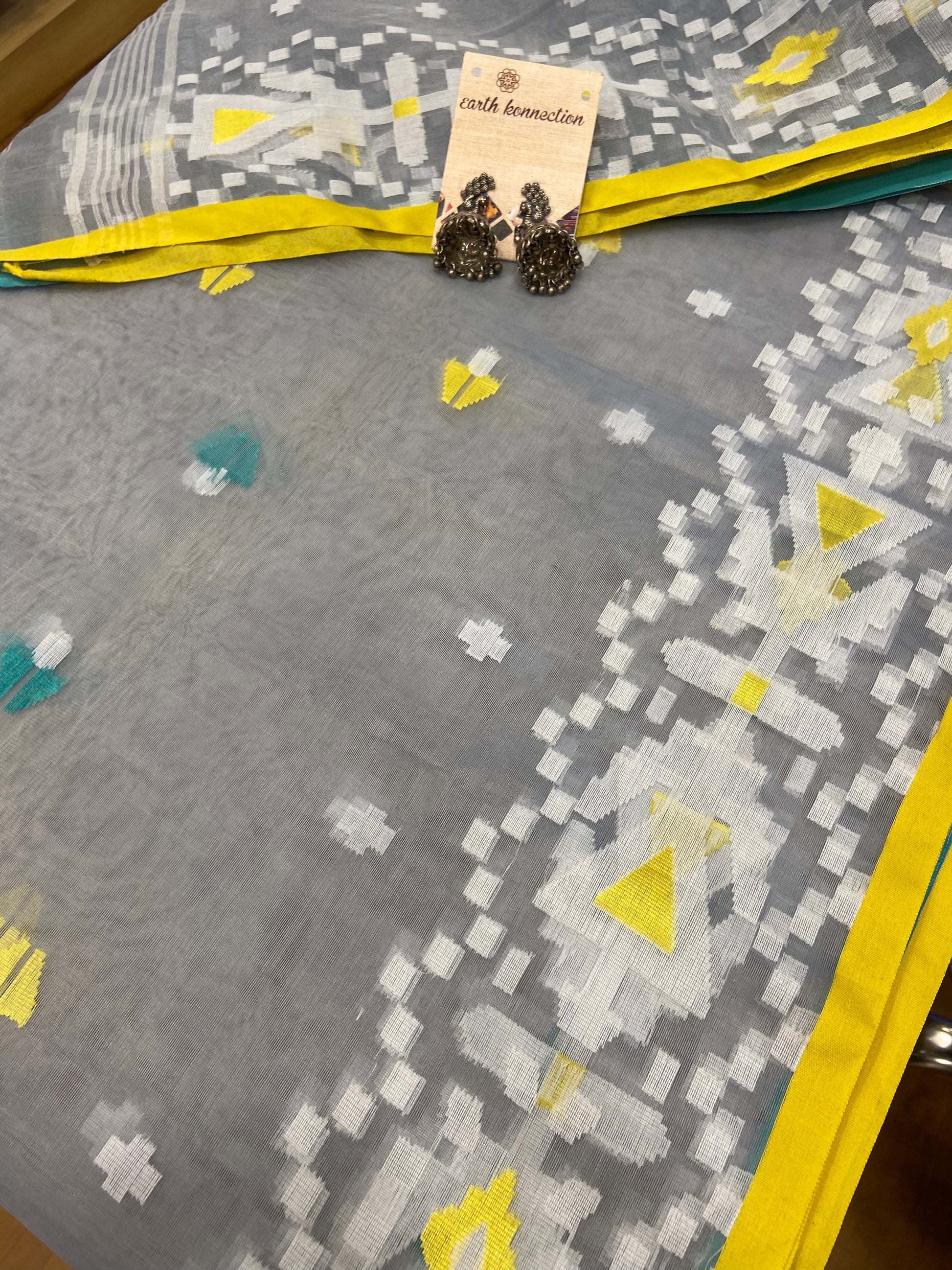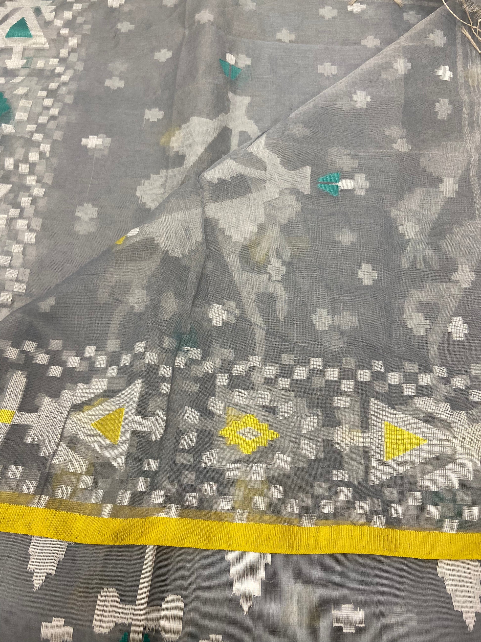 Bengali sarees are a beautiful representation of Bengal's reach cultural heritage and artistic traditions. Jamdani is touted as the most advance hand weaving technique in the world, in this saree has gray with rama green with yellow beautiful Ganga Jamuna border .