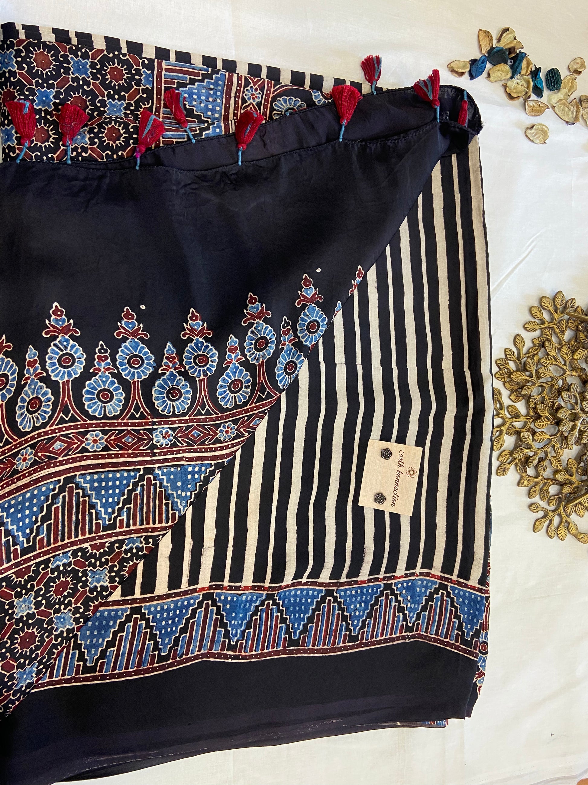 Modal silk sarees are a blend of modal, a semi-synthetic fiber made from beechwood pulp, and silk, which results in a soft, lightweight, and lustrous fabric. This combination creates a material that is more durable and easier to care for than pure silk, Ajrakh sarees, with roots tracing back to the Indus Valley civilization, represent the zenith of traditional block printing. Celebrated for their intricate geometric and floral patterns in deep, earthy tones like indigo, black, red, and mustard, these sarees embody a meticulous multi-stage dyeing and printing process.