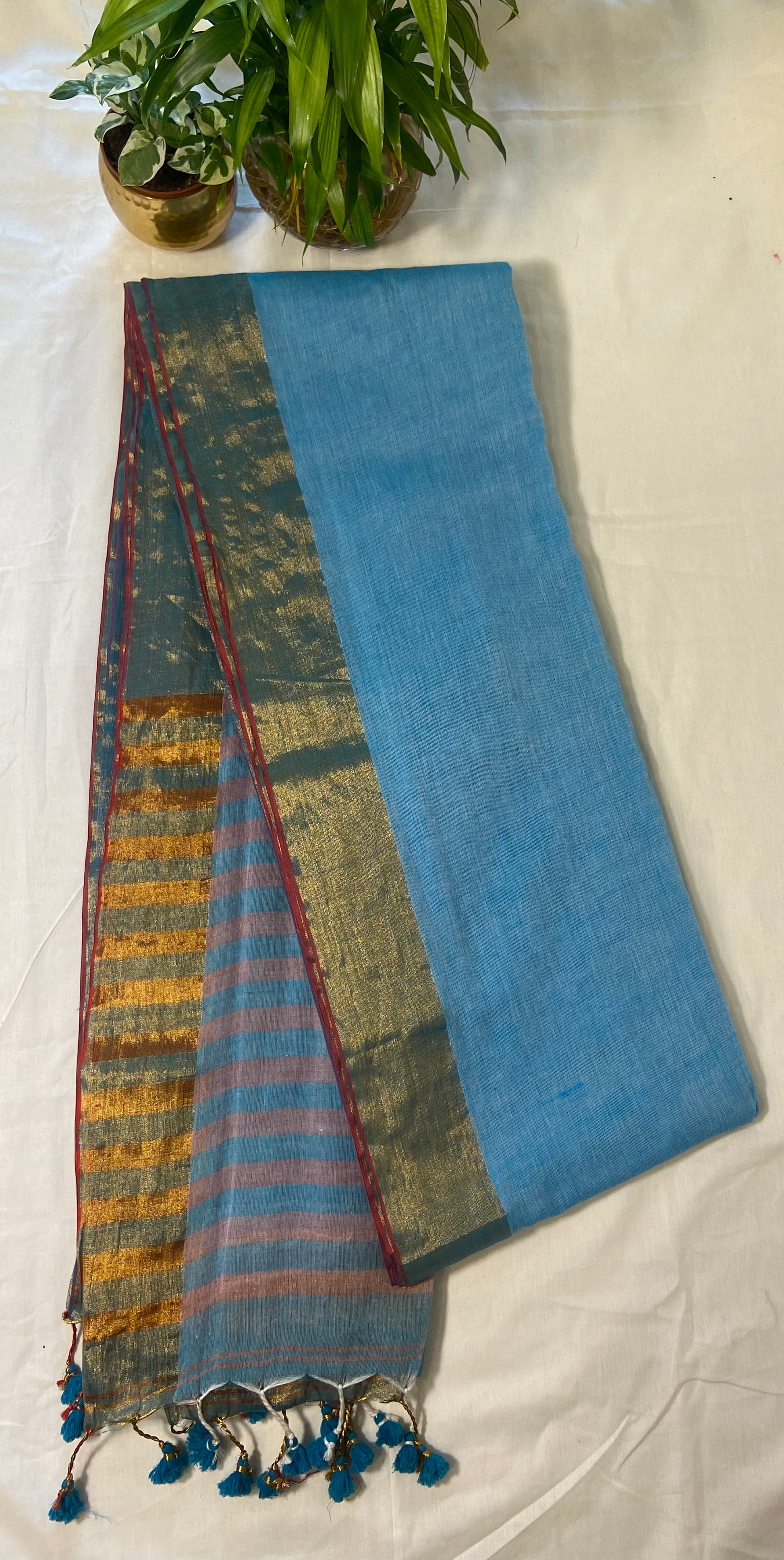 A'' Tissue mul cotton saree '' refers to a saree made of a light, soft cotton fabric called ''mul'' (also called mul mul'')that in woven in a way that creates a delicate translucent texture , resembling ''tissue paper. The tem tissue '' in this context describe the fitness and lightweight nature of the weaving , not the actual material.